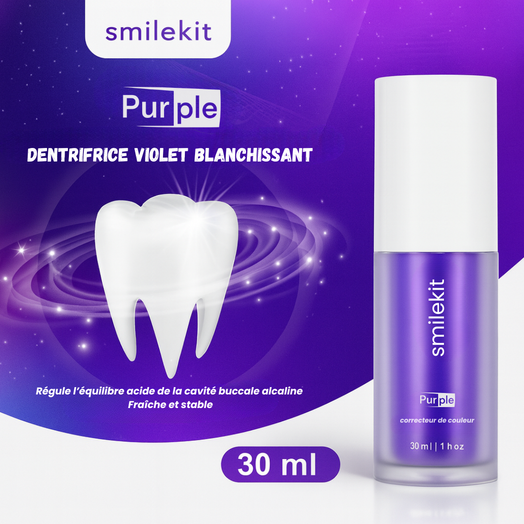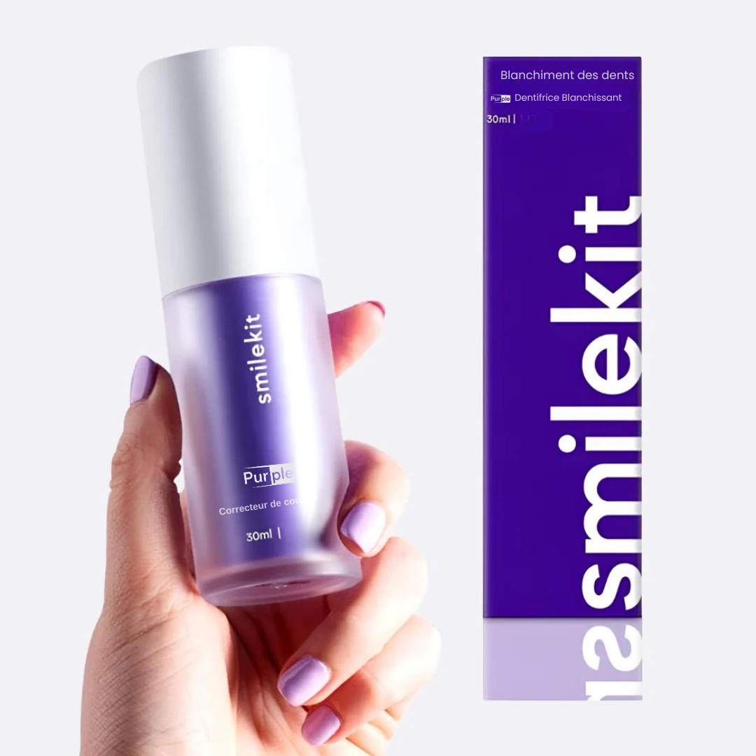 Le Smilekit Purple est un dentifrice correcteur de teinte innovant.Grâce à sa formule enrichie en pigments violets, il neutralise les tons jaunes présents sur les dents et fait ressortir un blanc éclatant et naturel, dès les premières utilisations.